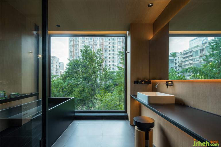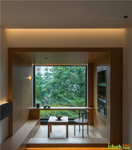 通過開窗面的限制,運(yùn)用框景的手法將室外景觀整理收納后引入室內(nèi),設(shè)計(jì)師酒店設(shè)計(jì)這種有限定性的“框景”在室內(nèi)看出去時(shí),屏蔽遠(yuǎn)端的樓宇,使人更專注于綠色景致帶來的寧?kù)o。