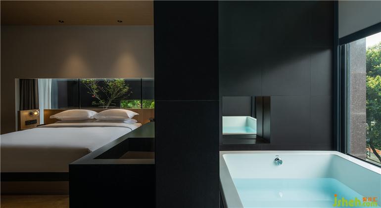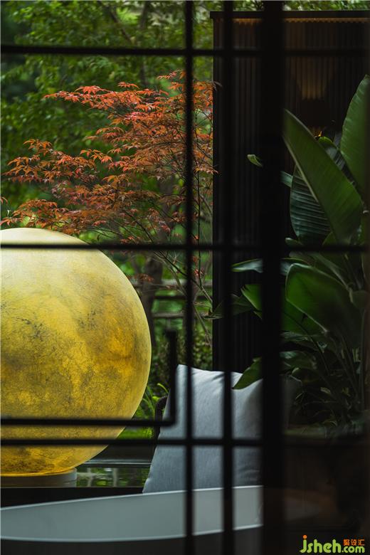 花園地面大面積采用黑色石鋪地與室內(nèi)的黑色地磚形成延續(xù)、設(shè)計師酒店設(shè)計通過點綴少量的疊石,苔蘚、紅楓。營造出小巧、靜謐、精致的戶外空間。
