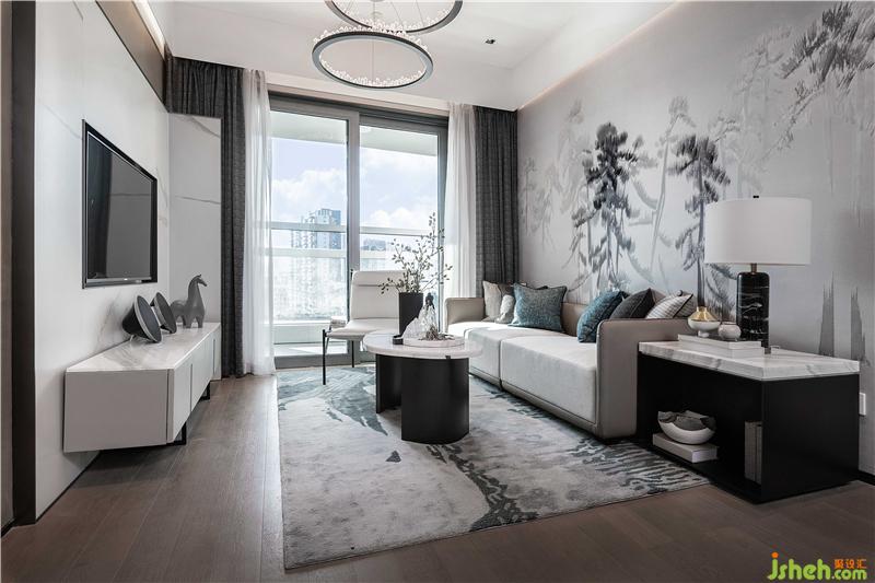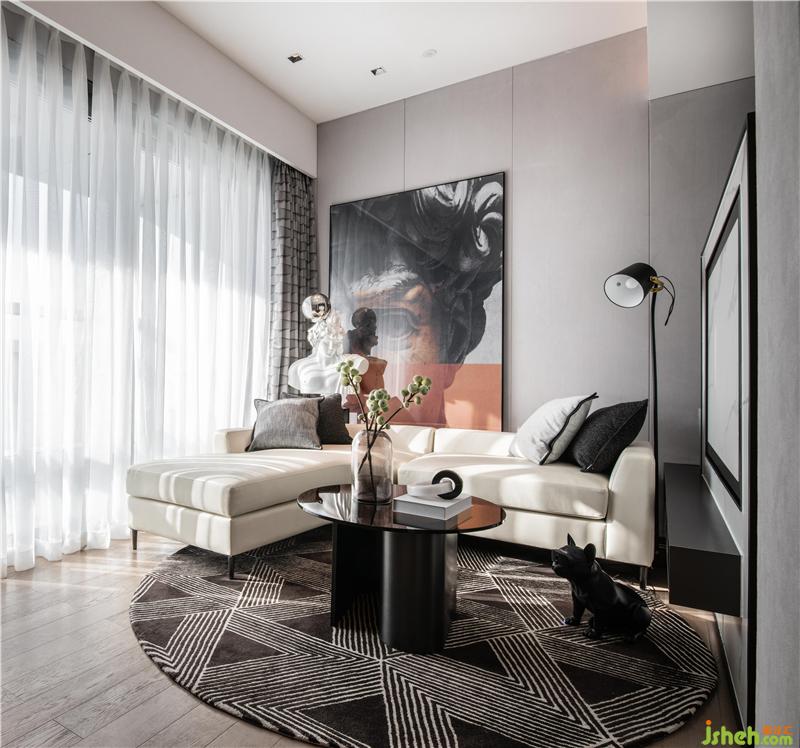 L型的沙發(fā)圍合成客廳,淺色布藝搭配深色地毯,明暗對比,不失穩(wěn)重。圓環(huán)玻璃茶幾呼應(yīng)圓形切割地毯,流露一種圓融柔和的美好生活希冀。