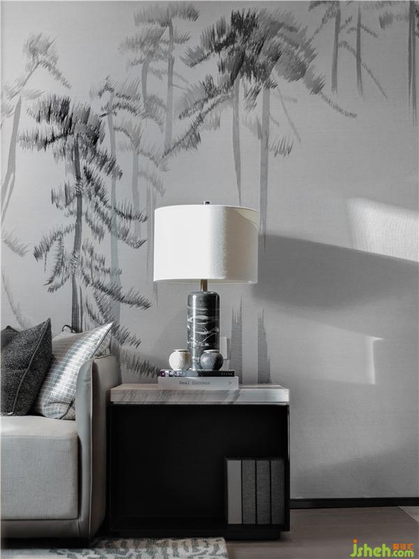 客廳設(shè)計優(yōu)雅大氣,簡潔高級。視線焦點處,松林手工刺繡墻布遠看如山巒起伏,深淺明滅,抽象寫意,力透紙背的東方情懷。