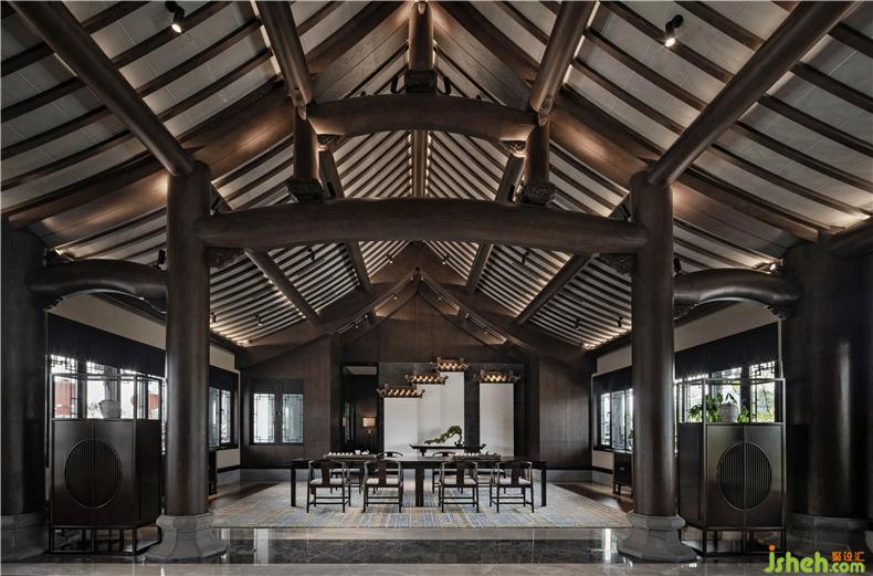 步入接待大堂,上方的冬瓜梁造型十分搶眼,視野縱深有屋瓦如鷹羽排序,橫向處有象征財(cái)富和棟梁之才的冬瓜梁(又名:元寶梁)充室盈屋,一縱一橫,大開大闔。
