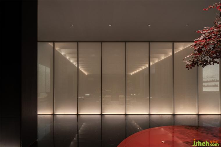 一扇紅色的漆皮質(zhì)長桌,居中而立,取色經(jīng)典的捫皮疊加亮光漆,在柔和的木色中聚焦人們的視線,展現(xiàn)空間尺度與品質(zhì)營造的本身。
