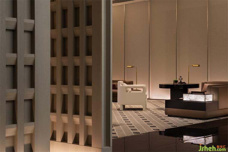 利用原建筑條件的場地高差,西安營銷中心設(shè)計接待前廳區(qū)形成了相對下沉的內(nèi)斂情緒。薄透的絹布絲綢營造的“虛”、渾厚的古銅鋼制造的“實”,人們行走在如水、如鏡的地面,接受著全然沉浸式的空間體驗。
