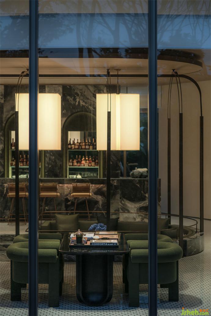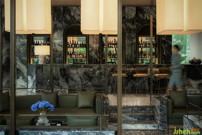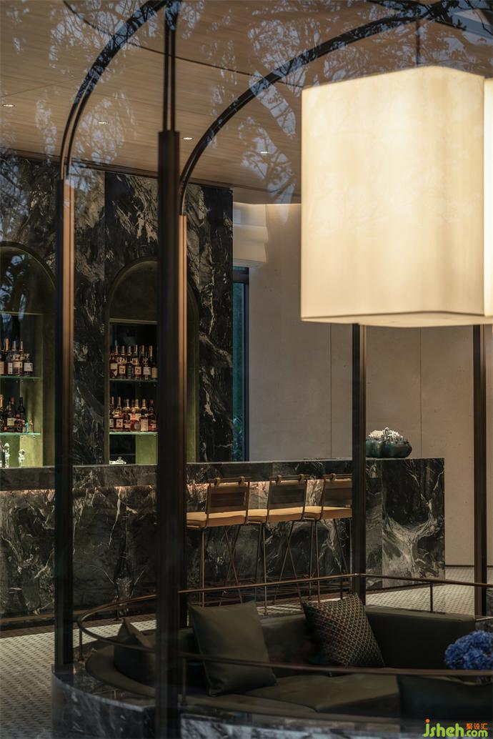 自然感的橄欖綠,在大理石蕩漾如水紋般暈開的紋理里,形成了一種內(nèi)斂而靜謐的情愫,空間于此細(xì)細(xì)流淌開來,并將人們空間探索的感官、心境,全然沉浸,帶入這如森海秘境的空間之旅中。