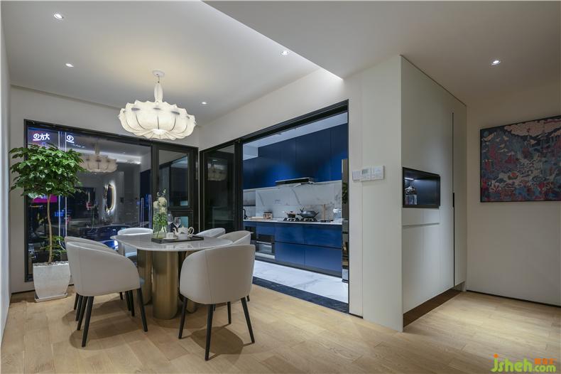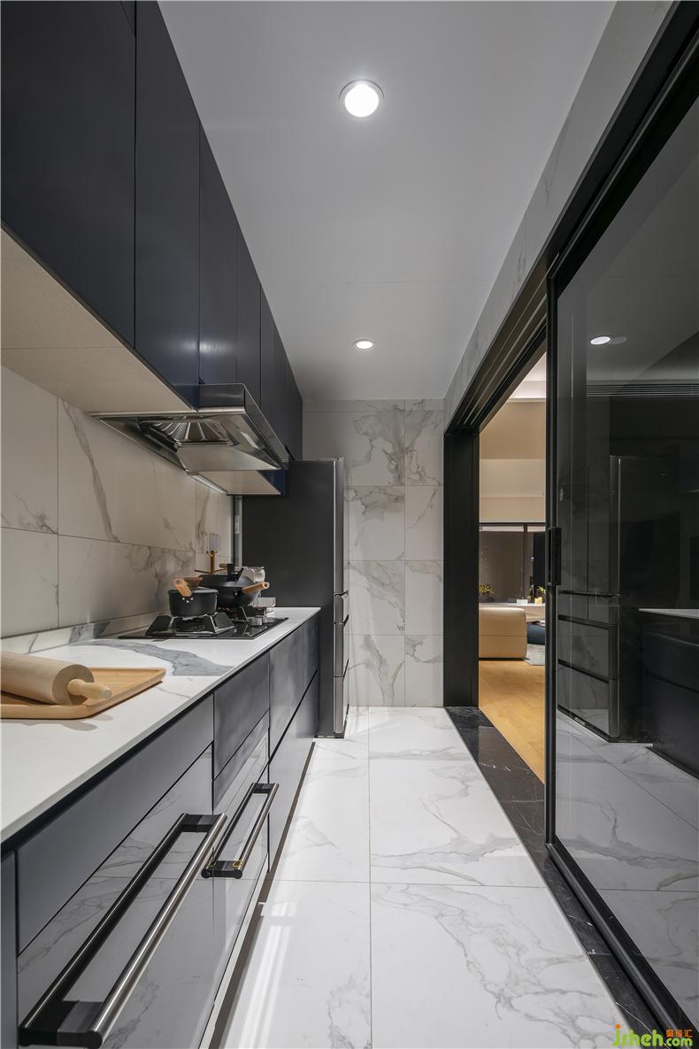 Translucent sliding door, let kitchen and dining room in visual space infinite extension. The restaurant adopts grey Marble & black home decoration, which makes it fresh and tidy.