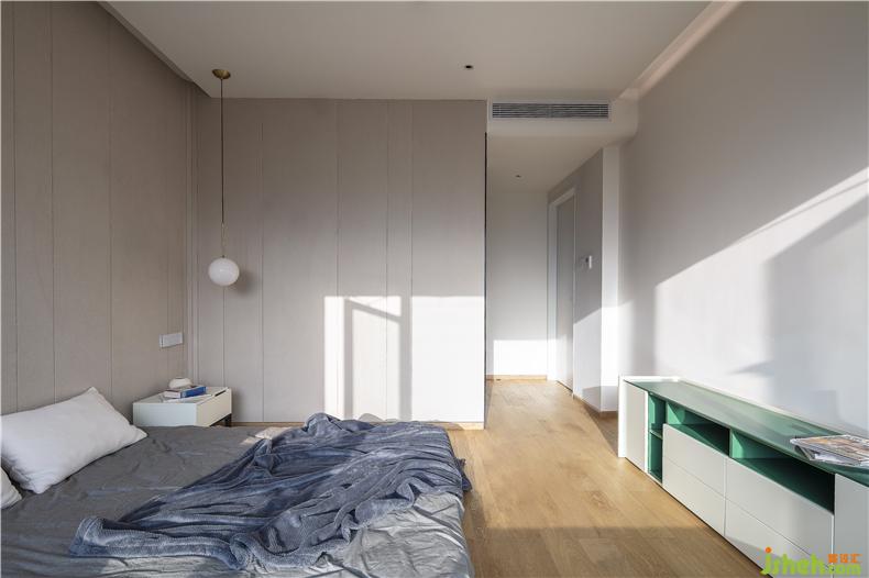 早晨的第一縷陽光洋洋灑灑地落到地板上,點亮主臥和我們新的一天。