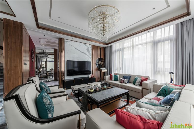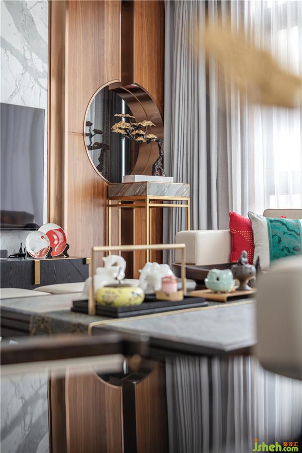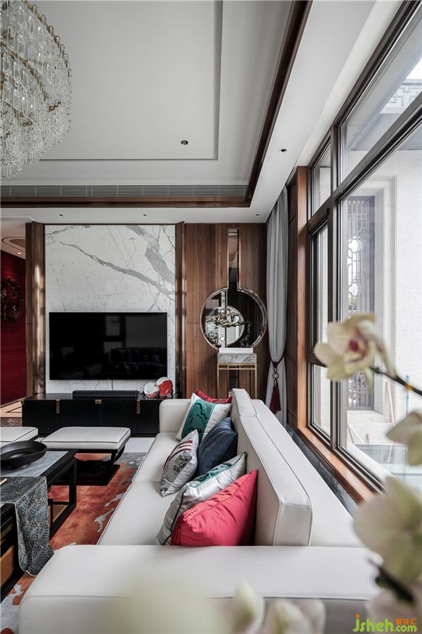 The plum blossom in the corner and the pine tree beside the TV add a warm flavor to the original cold living room. The atmospheric chandeliers and the ornaments on the tea table, the colorful pillows echo the cold white sofa, making the beauty of the whole living room more warm.