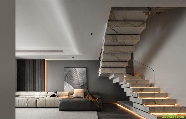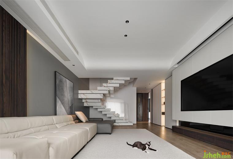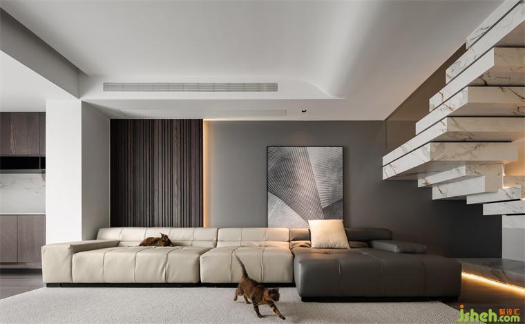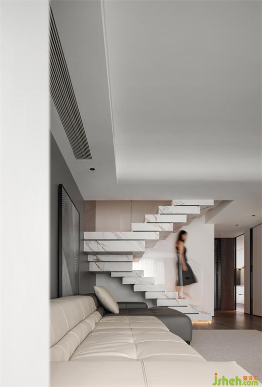 遵循簡(jiǎn)約而低調(diào)的設(shè)計(jì)手法,復(fù)式豪宅設(shè)計(jì)用大面積的白色來(lái)詮釋宅家的靜謐與安然,削減空間的厚重感。
