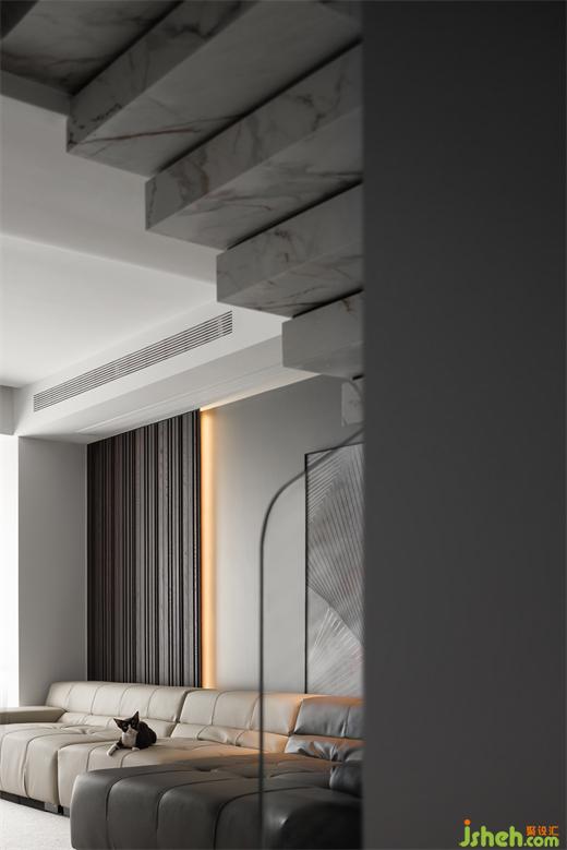 本案業(yè)主是一對(duì)新婚夫婦,對(duì)于品質(zhì)和收納有極高要求。因?yàn)榧抑杏幸粴q萌寶和兩只愛(ài)寵,空間設(shè)計(jì)得較為靈活且收納性能攀升,客廳取消茶幾以盡可能釋放出更多活動(dòng)空間。復(fù)式豪宅設(shè)計(jì)基于未來(lái)小朋友的練琴需求,多功能房預(yù)留了足夠的尺度。
