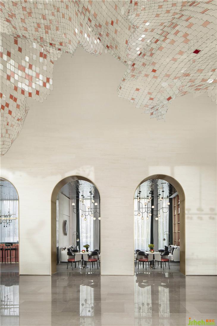 藝術(shù)長(zhǎng)廊呈現(xiàn)了藝術(shù)的景深和時(shí)空的夢(mèng)境,一扇扇拱門營(yíng)造著端莊的序列感和層次感,節(jié)奏緩慢地帶人穿越藝術(shù)隧道,穿越宮殿紅的壁墻,回望煙波浩渺的歷史長(zhǎng)卷。室內(nèi)設(shè)計(jì)師
