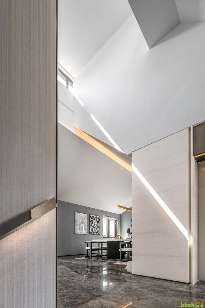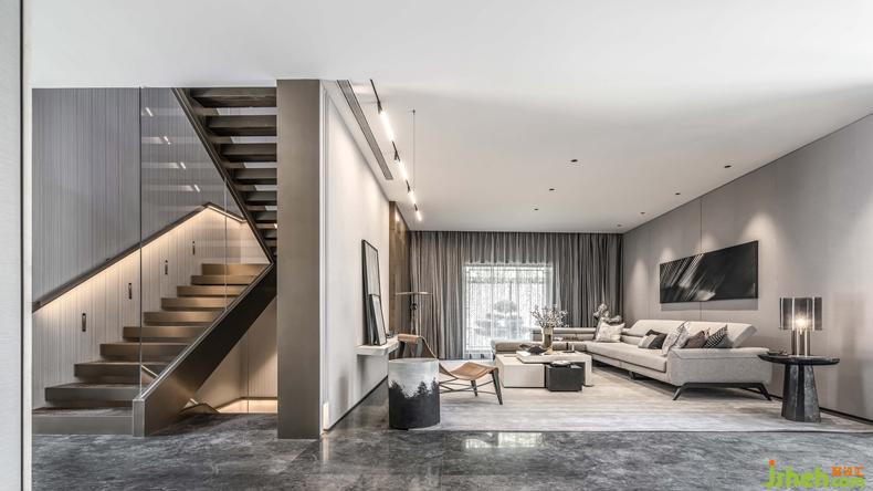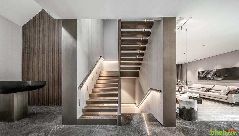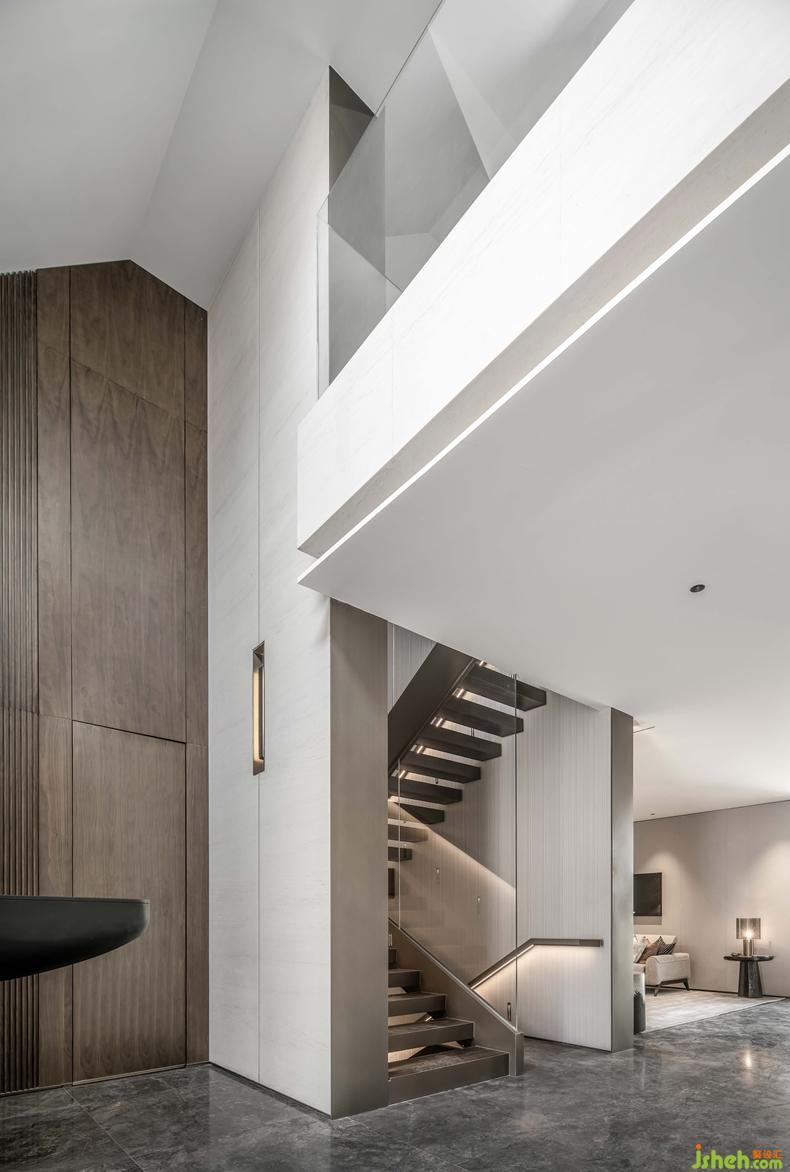 挑高的樓梯區(qū)將精致的生活格調(diào)層層鋪開,利落的線條伴隨暖色光線充盈其中,表達精致的空間訴求。金屬材質(zhì)的冰冷在人與人的連接中,帶來一絲暖意與高雅之感,串聯(lián)起室內(nèi)的情感主線。別墅裝修設(shè)計
