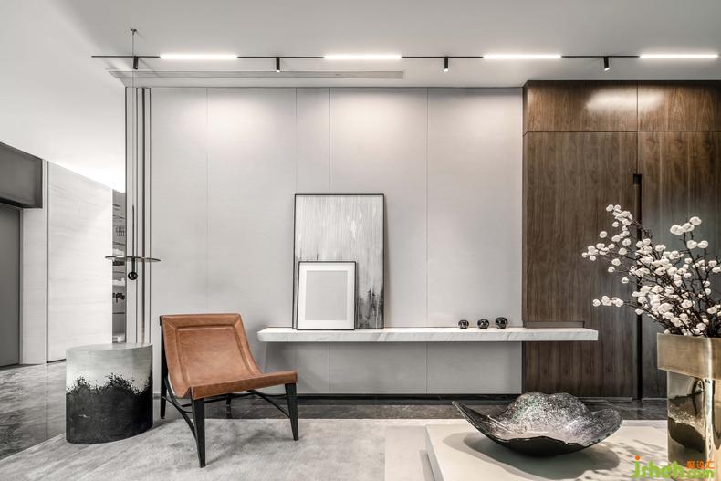 低飽和色調(diào)墻面點綴黃銅邊框呈現(xiàn)出高品質(zhì)生活氣息。兼顧實用性與舒適性的橙色皮質(zhì)躺椅搭配灰色絨毛地毯,舒適的觸感、清新的配色,塑造別樣的居住美感。別墅裝修設(shè)計