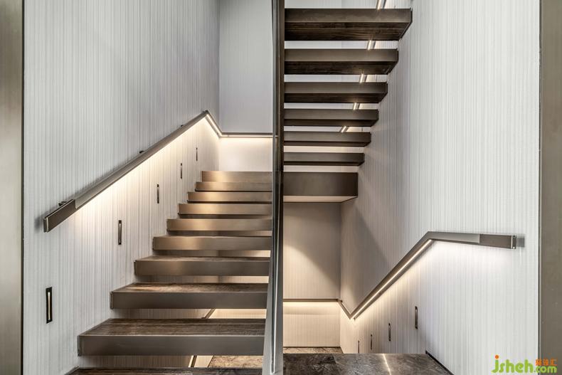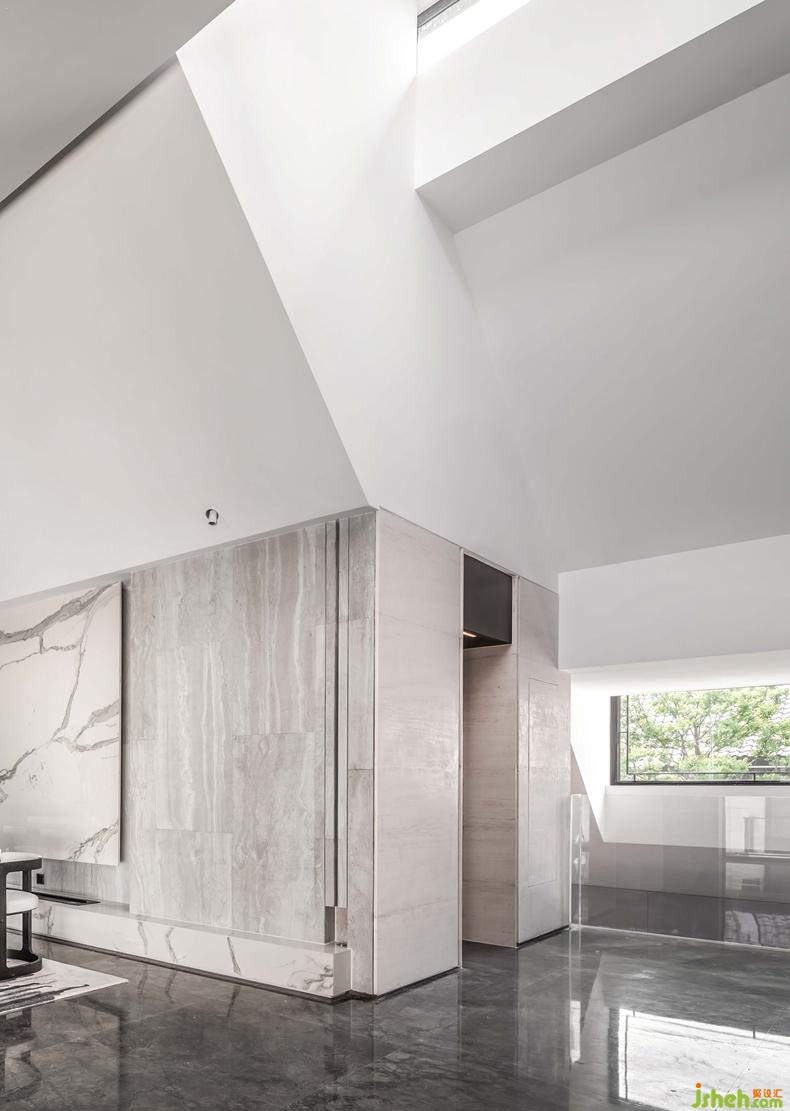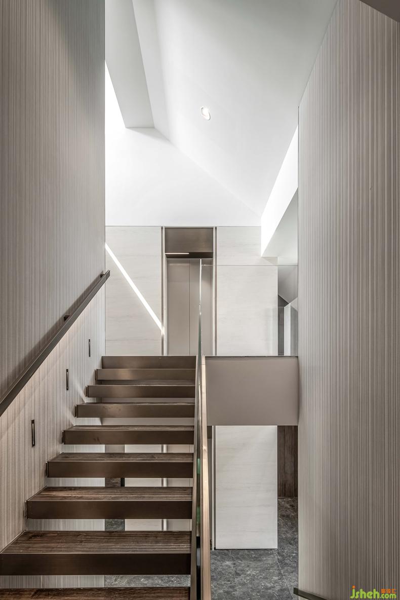 樓梯旁開合性更強(qiáng)的空間,連通室內(nèi)與室外,引入了更多的自然光。空間縱橫貫通,視野通透而開闊。