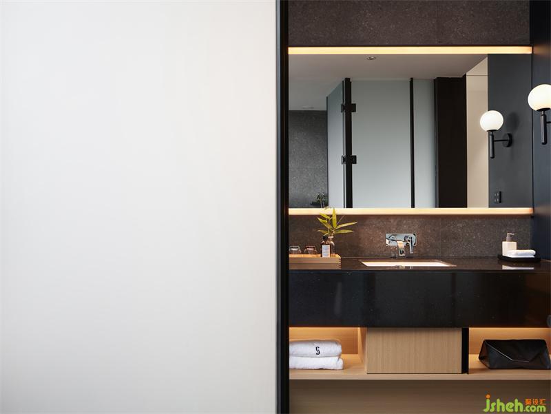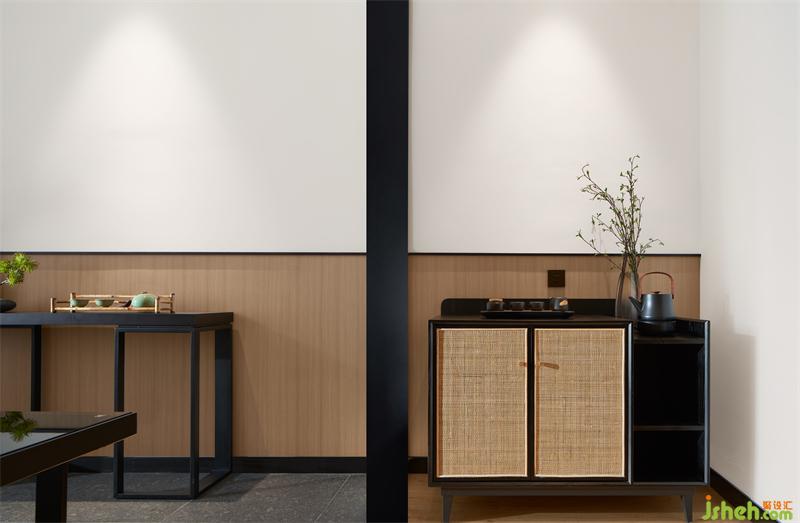 走道以利落的黑色線條對(duì)空間盡顯切割,運(yùn)用對(duì)稱美學(xué),既能穩(wěn)定空間結(jié)構(gòu),又給予空間空間寧?kù)o感,引入氛圍。
