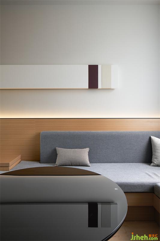 從功能性物體著手,我們將以往單獨(dú)的個(gè)體拎出來——如會(huì)客區(qū)的椅子、電視、置物架等等,將其與空間結(jié)合,空間的一體性得到了充分的保證。