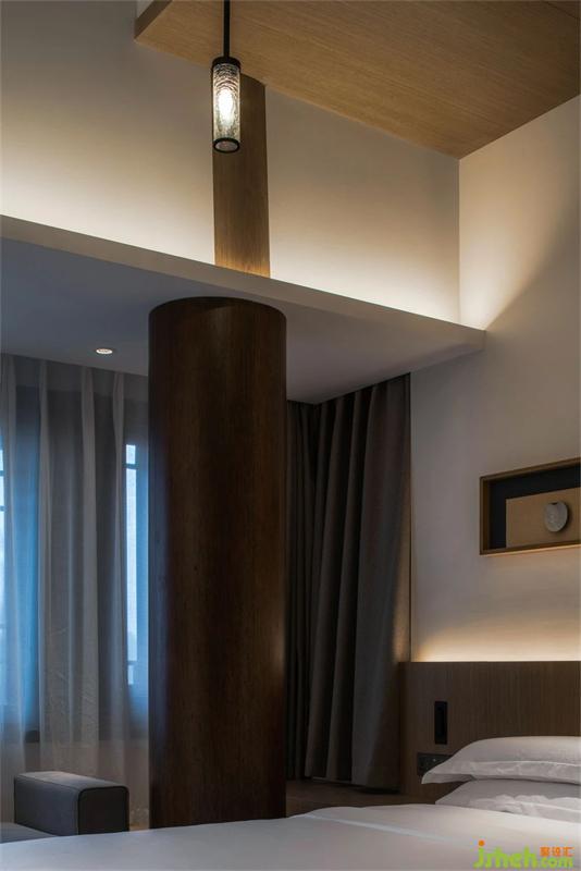客房既有的瓦片坡屋頂及梁的仿古效果并不理想,有些拙劣,設(shè)計(jì)采用淺色橡木對(duì)梁柱進(jìn)行了新的裝著,梁柱之間的空間加入線形吊燈高低錯(cuò)落的排列達(dá)到弱化瓦片屋頂瑕疵的作用