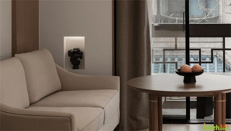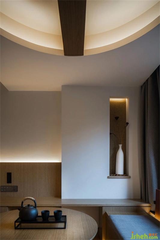 客房室內(nèi)空間造型運(yùn)營幾何手法進(jìn)行切割,簡潔利落。通過光滑的白色涂料和質(zhì)樸編織墻布形成對比帶來視覺上的賞心悅目。
