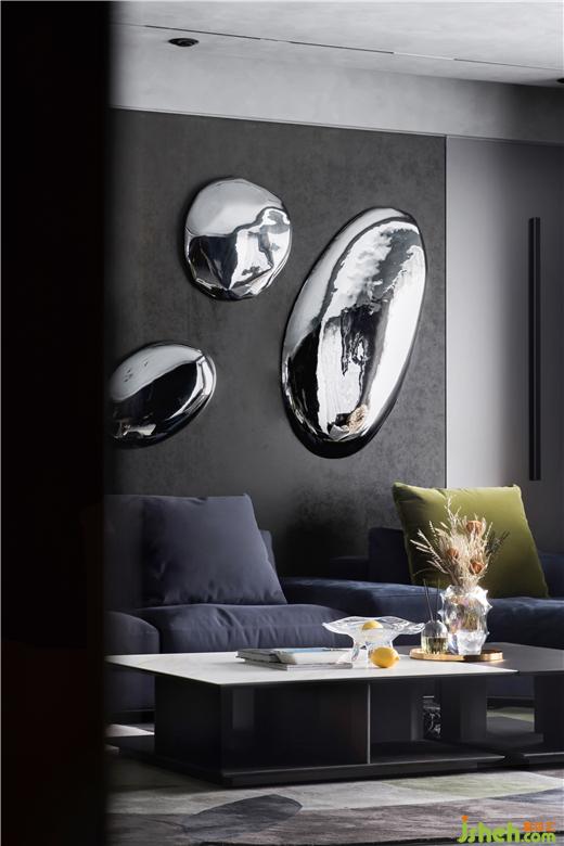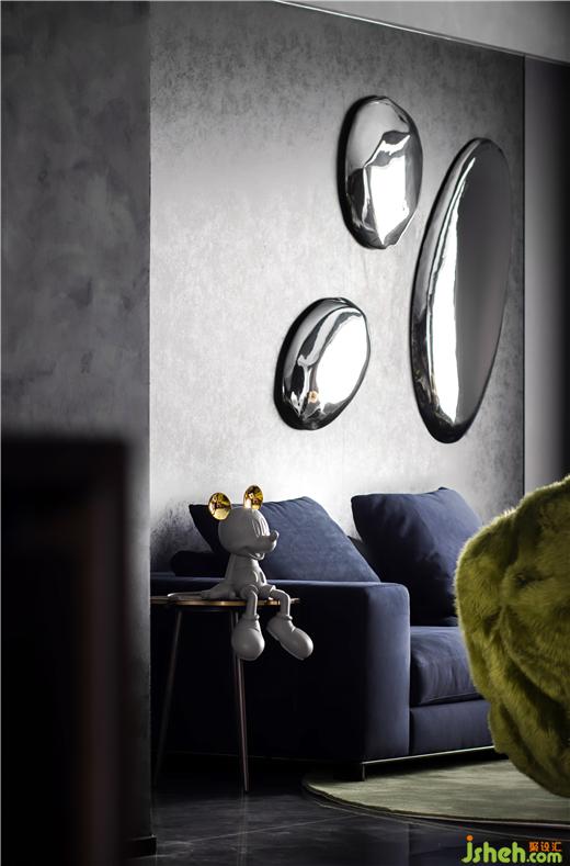 居住空間是屋主生活態(tài)度的展演。踏入玄關(guān),坐姿米奇營造出愜意舒適的歸家儀式,大平層裝修設(shè)計具有線條感的金屬置物架顯示出主人不凡的品味。在32㎡的恢弘客廳中,經(jīng)典藍的高雅、橄欖綠的輕奢、金屬銀的硬朗從灰黑色的沉靜背景中跳脫出來,豐盈了軟裝的層次感,多元而立體化地呈現(xiàn)空間個性。自由多樣化的家具隨心組合,迎合當(dāng)下時代年輕人的社交場景。