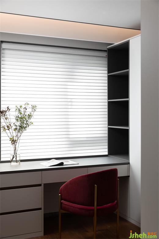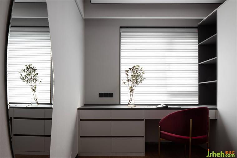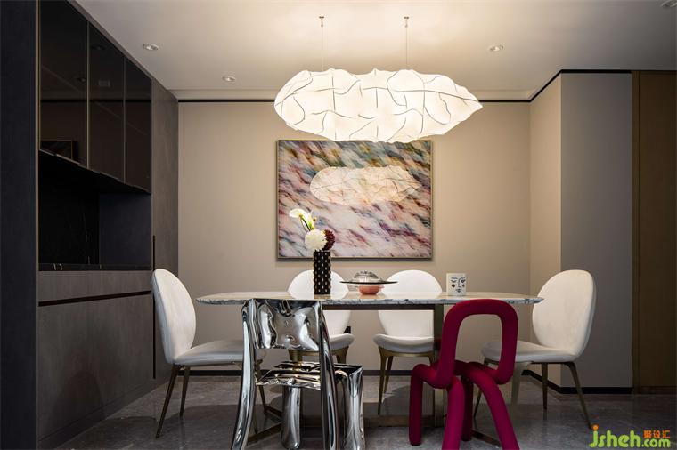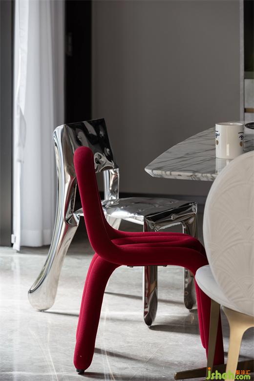 紅色和不銹鋼材質的餐椅組合,中海望京府復式家裝設計營造了集品質、藝術、舒適為一體的輕奢生活方式。一餐一食,一酌一飲,一家人圍著餐桌享受美食,偶爾伴隨幾句嬉笑,繪就了一幅幸福美滿的和諧畫面。