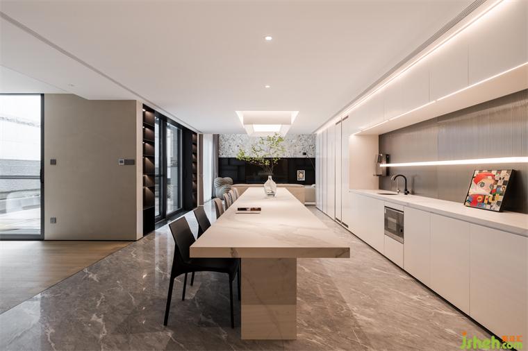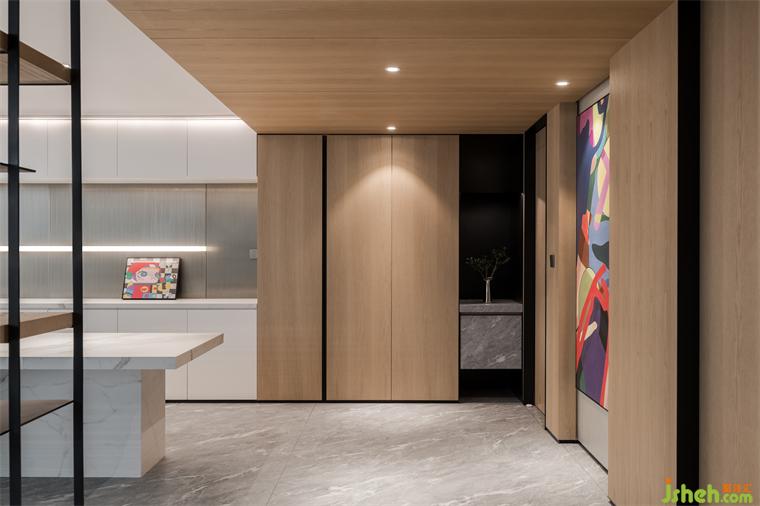 一側(cè)則是西式餐廳空間,簡約的吧臺,充滿著現(xiàn)代感,又不失溫暖和舒適,溫暖絲絲沁入空間的木紋墻面,可以作為簡餐餐桌烘焙等西式料理操作臺實用,在這里獨自品酌或與親朋對飲,情思爽然,乃人間樂事。