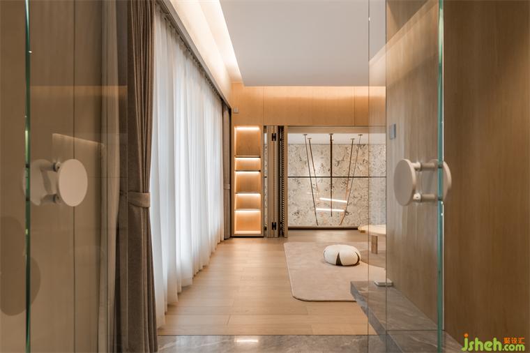一層入目增加了開放的休閑娛樂區(qū),讓過渡空間充滿了想象,柜體細(xì)節(jié)處燈光設(shè)計,留白轉(zhuǎn)折拉開層次,或坐或躺也是自在其中。挑空之下,流線型吊燈輕垂錯落有致,大理石肌理垂直蔓延,在這里,場景交織下,互動重塑空間意趣。