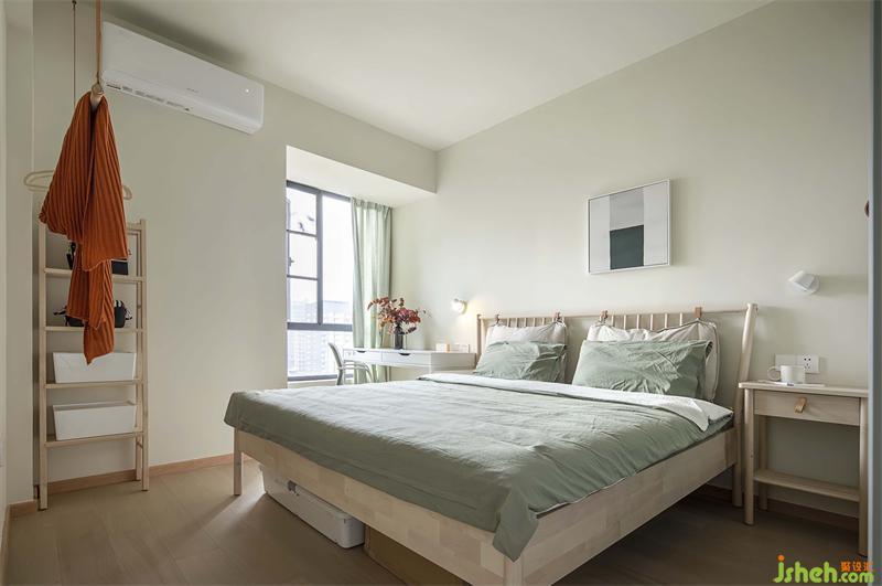 臥室,我們希望是輕盈而溫馨的氛圍。主臥的家具是屋主一起組裝的,包括衣柜內(nèi)部空間,是按需購買配件布置,隨時可以變換的空間增加了生活趣味性和新鮮感。樺木皮革則是屋主喜歡的元素,材質(zhì)本身的特質(zhì)就能營造出輕盈自然感,軟裝上對顏色的調(diào)和使得整個空間更加和諧統(tǒng)一。