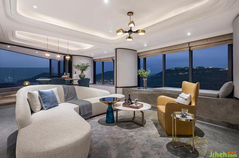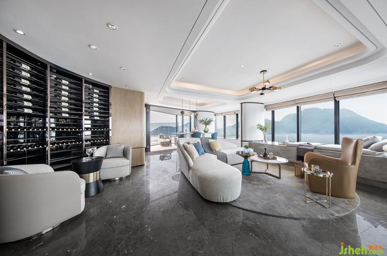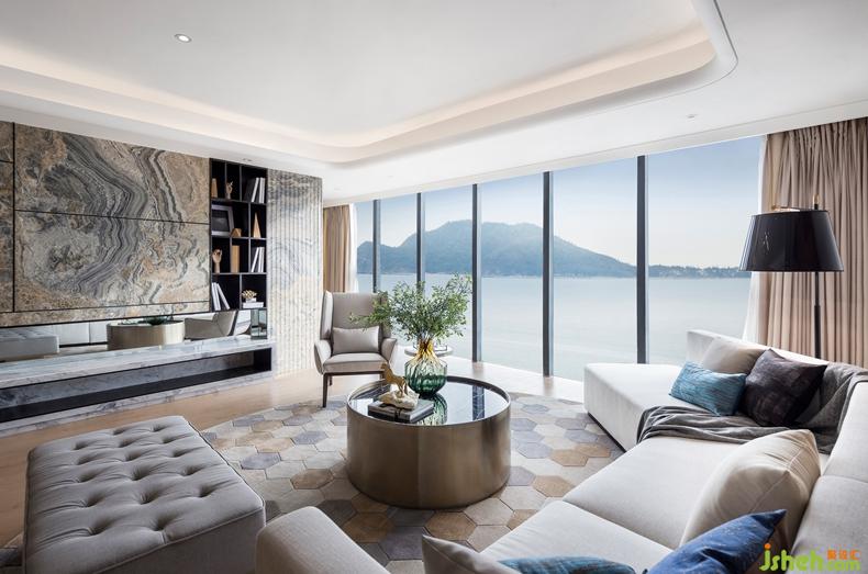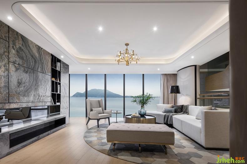 大面積的通體落地窗,以最大尺度對(duì)灣區(qū)進(jìn)行場(chǎng)景化定格,將絕美風(fēng)光引入室內(nèi),縱目遠(yuǎn)觀,獨(dú)屬于海邊的愜意感受得以鋪陳抒發(fā)。開(kāi)敞式的生活起居區(qū)功能協(xié)調(diào)連貫,曲線優(yōu)美的背景墻作為停頓穿插其中,隔而不斷,避免空間的冗長(zhǎng)感,與窗外連綿不絕的海景呼應(yīng)成趣。