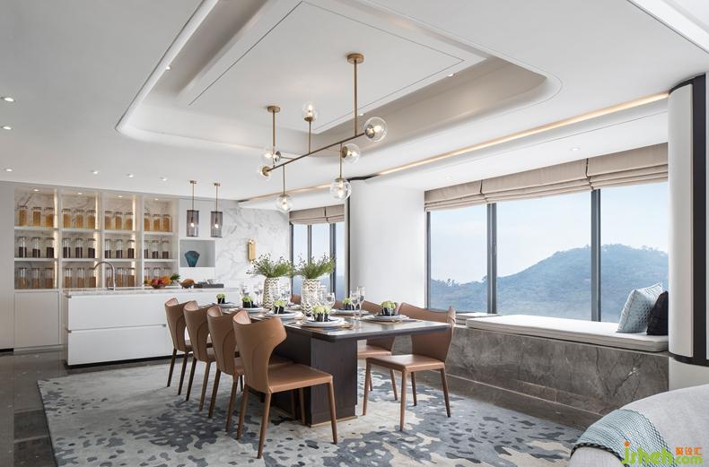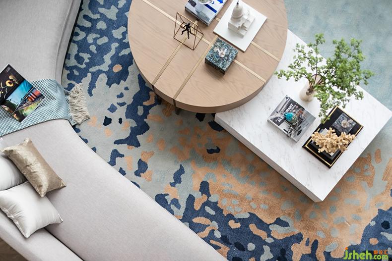 不規(guī)則的家具和藝術品于此巧妙邂逅,在比例、情緒和故事間平衡出了自由生動的韻味,處處貫穿恬逸和諧。優(yōu)美的沙發(fā)弧線,木質(zhì)與理石拼接的茶幾構造,搭配浪花般活潑的地毯,色彩跳躍的布藝軟裝從客廳蜿蜒至餐廳,可謂到處皆意境,隨時有物華,設計公司為空間增添耐人尋味的藝術內(nèi)涵,引發(fā)海灣生活方式的無限思考與探索。