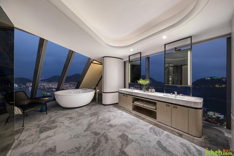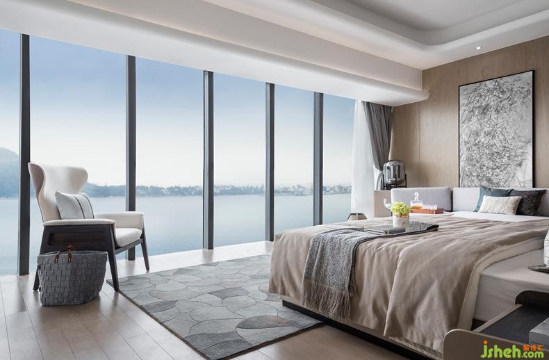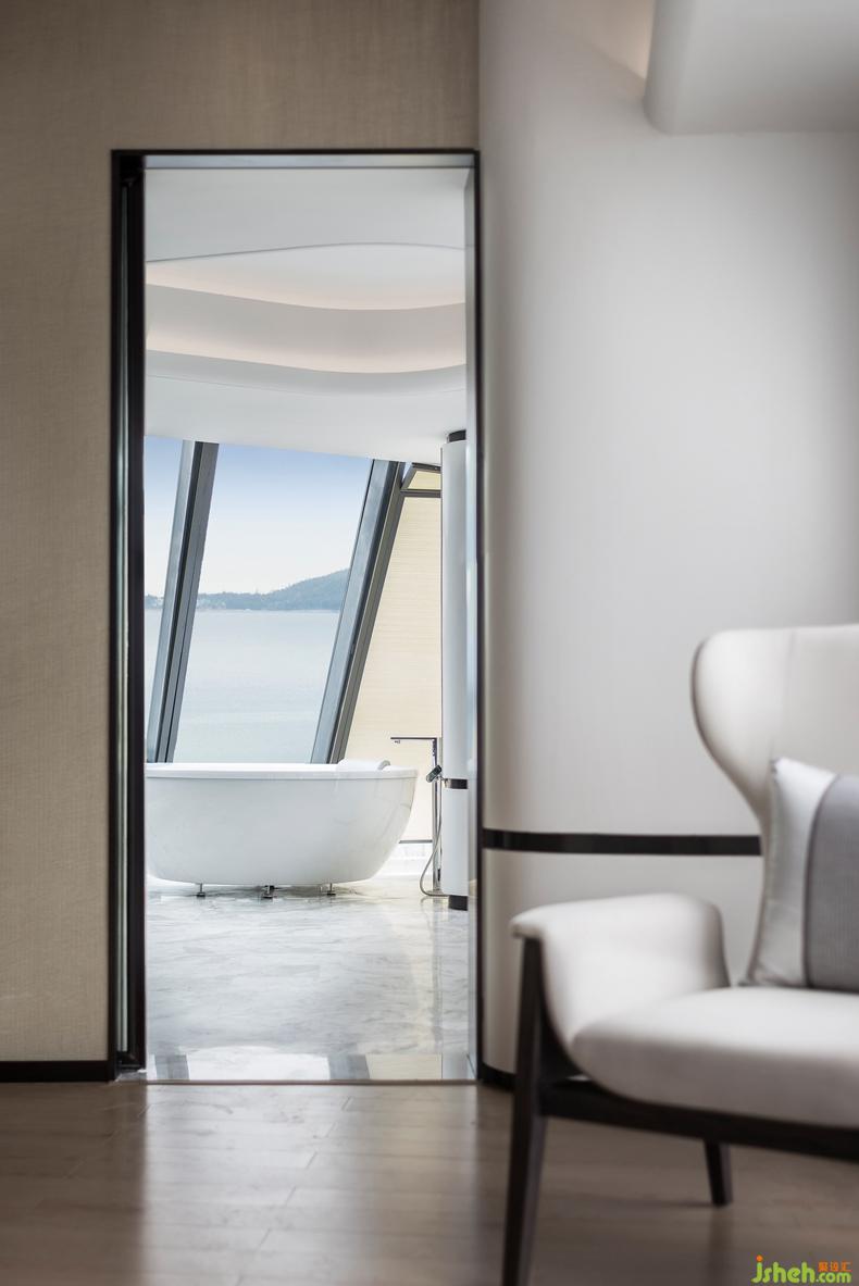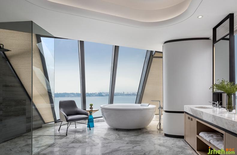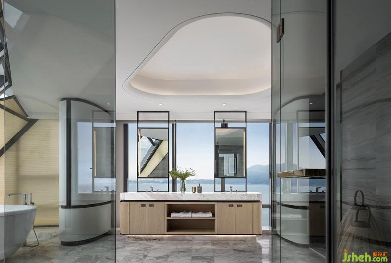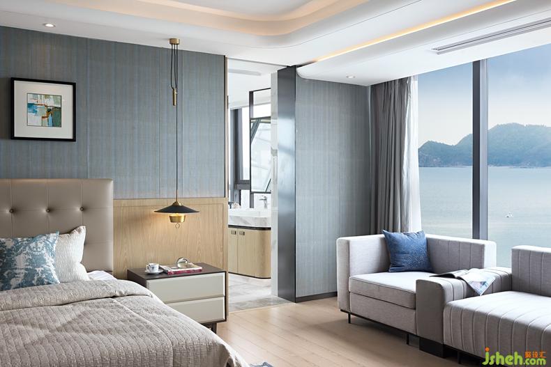 木飾背景墻與皮革床屏組合,訴說著主人低調(diào)奢華的個性。設(shè)計公司高雅大氣的卡其色絲緞與沉穩(wěn)睿智的藍(lán)色飾品,不喧嘩而獨具格調(diào)。浴室線條簡練利落,保持大面積玻璃窗,強化了場所的穿透感,接受陽光更為純粹的洗禮。臨窗望海的全景浴缸,領(lǐng)略坐擁港灣的曼妙樂趣。傍晚時分,斜陽余暉灑入室內(nèi),整個空間都被抹上一層黃暈。潮起潮落,華燈初上,使居者充分體會設(shè)計師想要傳遞的閑適心境,盡享生活輕松喜悅的美好品味。