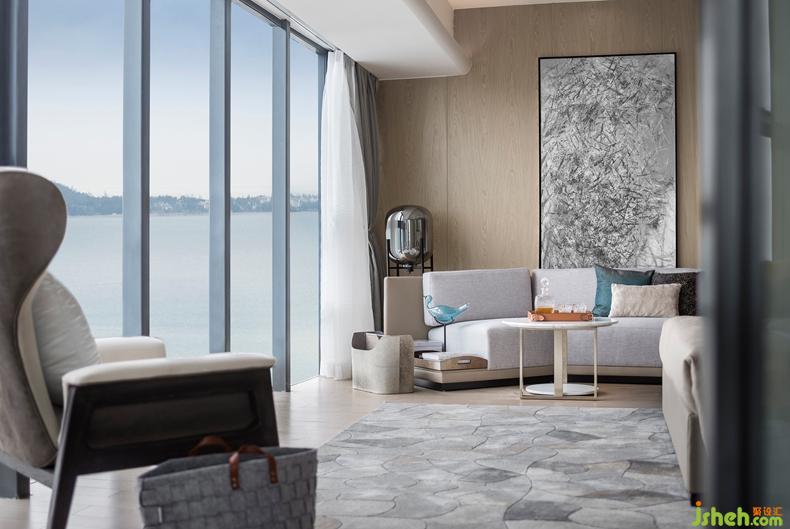 「海邊的生活,期待的是心靈的放松與沉淀,不適合過多的贅述。」設(shè)計師說。臥室墻體與地面保持純凈,180°的海景作為巨幅杰出畫作取代了其余裝飾。幾何線紋地毯,抽象藝術(shù)掛畫,色澤柔和的定制沙發(fā),無一不透露社會新銳回歸質(zhì)樸而內(nèi)蘊深遠(yuǎn)的生活追求。