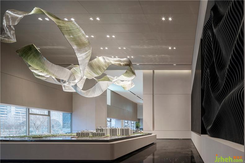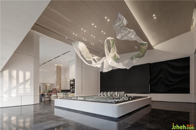 沙盤由潔白石材托舉,帶來萬千氣象,城市的理想生活于此鋪開。墻面木飾面輔以白色石材,室內(nèi)設(shè)計(jì)師斜坡屋頂設(shè)計(jì)的天花,呼應(yīng)中式古老建筑,吊燈形似運(yùn)河,以水為紐帶,如若光影連動(dòng)將過去與未來聯(lián)接,描畫多元文化交融下的繁華之景。