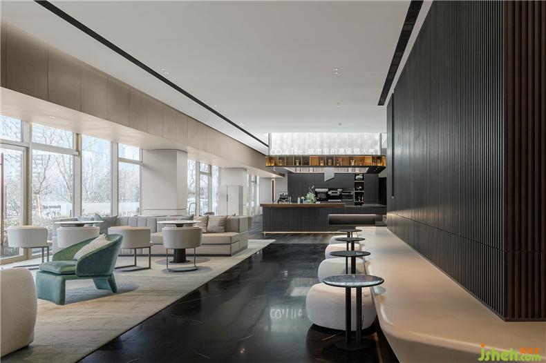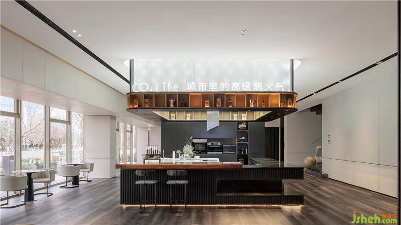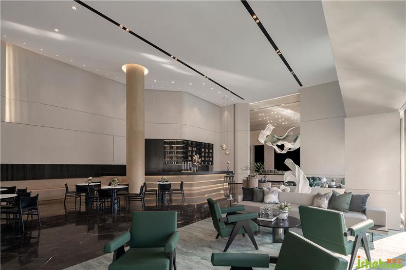 咖啡吧臺,深色與白色石材相拼,在燈光的暈染下,與深色的木飾面背景,室內(nèi)設計師融匯成一幅現(xiàn)代時尚、香氣濃郁的空間畫面,同時植入互動打卡裝置,現(xiàn)場可親自體驗手沖咖啡,滿足社交分享新流行。醇厚的咖啡香氣彌漫一室,別具一格的情調(diào)呼之欲出,咖啡文化的詩意切面展呈得淋漓盡致。