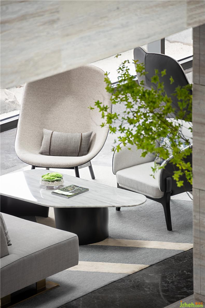 沙發(fā)休閑區(qū)融入了云石與綠植,帶給空間一絲生機(jī)和活力,營(yíng)造愜意舒心的休閑空間。青島會(huì)所設(shè)計(jì)米灰色沙發(fā)與單椅圍合嚴(yán)謹(jǐn),營(yíng)造出規(guī)整的空間布局形態(tài)。沙發(fā)線條柔和,結(jié)合大理石不規(guī)則的茶幾,于簡(jiǎn)約中蘊(yùn)藏豐富的層次美。