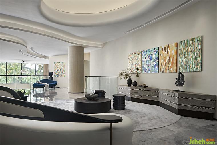 社交中空客廳、西式餐吧、私人影院、酒窖、健身室等功能圍繞著露天泳池展開,各空間之間沒有明顯的界限,彼此形成通暢的流動(dòng),不同生活場(chǎng)景自由切換。
