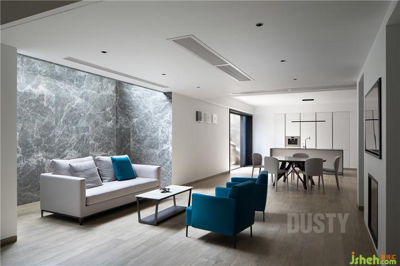 別墅裝飾每一個設計需在滿足功能性的需求上的同時呈現(xiàn)美,又能符合居住者的真實需求。在此設計理念里,我們將原始結構里在一層的餐廚,移置到負一層,使負一層的使用率達到最大化,廚房的空間也變得更為寬敞。色彩上,藍色的加入,與整體的灰白色調(diào)共同營造出輕奢的質(zhì)感。
