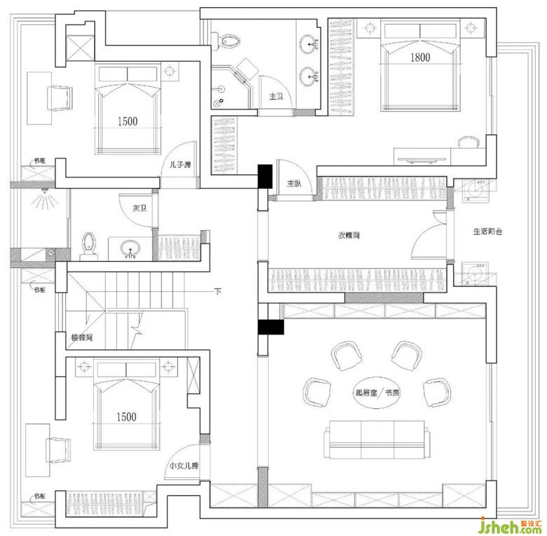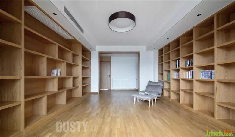 客廳頂上搭出的空間作為起居室兼書房,它們之間的通道設(shè)計為衣帽間區(qū)域,不多占用空間的基礎(chǔ)上,滿足收納功能。