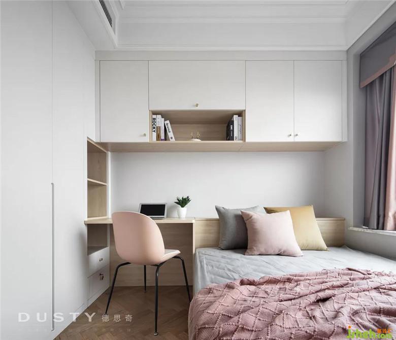 榻榻米的空間留給父母過來住,在這里設置了一個組合柜,讓書桌、床、衣柜、吊柜形成一個整體。裝修公司用經(jīng)典的白色和木色搭配顯得空間溫馨明亮。