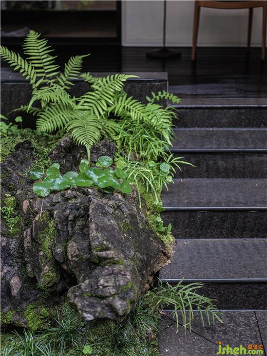還有就是我們重點打造的花園,一直以來我們致力于打造桂式園林,桂式園林有別于傳統(tǒng)園林,也有別于司空見慣的日式園林。這個花園也是我們對桂式園林的一個實踐,桂式園林就是要突出它的地域特征以及山林氣息,展廳設(shè)計呈現(xiàn)它的野趣之美。我們選擇造景用的石頭就盡量在山野中找那些形態(tài)以及比較容易養(yǎng)護的山石。