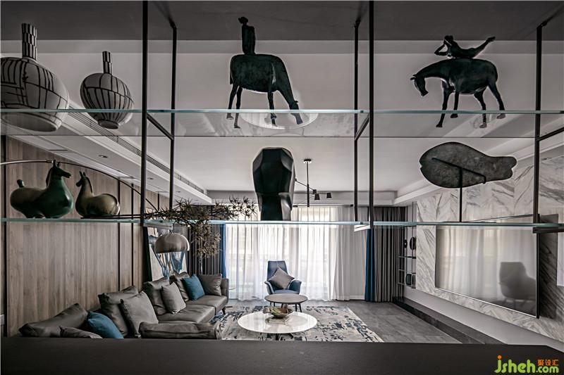 客廳左邊設(shè)計了玻璃金屬層板與進(jìn)門口鞋柜上方的玻璃層板呼應(yīng)。