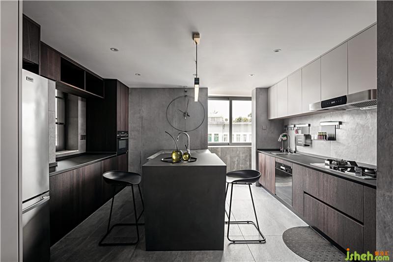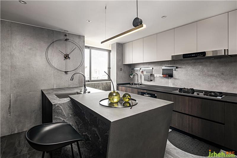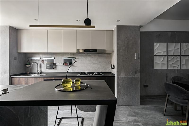 灰色從客廳貫徹到廚房——意大利LAMINA太空黑至純廚臺(tái),以及意大利LAMINA銀豹洗手臺(tái),還有水泥灰大磚墻等營(yíng)造出廚房工業(yè)風(fēng)粗糙厚重的質(zhì)感,整個(gè)空間的氣質(zhì)——藝術(shù)、帥氣、野性。