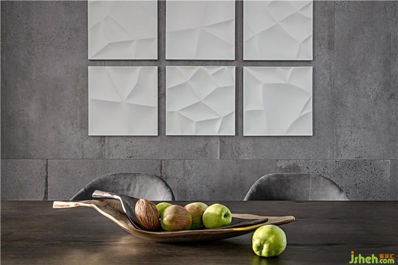 餐廳與客廳銜接,空間關(guān)系一目了然。整體空間層高2.7M,裝了中央空調(diào)后為2.4M。為了在視覺(jué)效果上拉伸層高,避免空間局促,餐廳主墻與地磚都是采用1500*700CM的大磚錯(cuò)縫鋪貼。