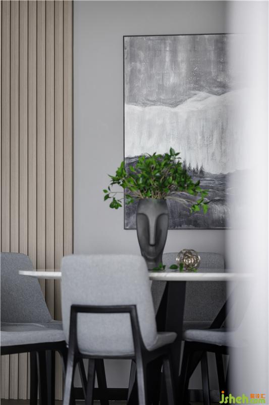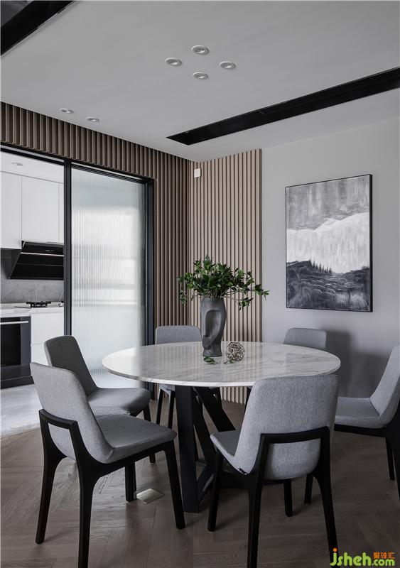 敞開(kāi)式的廚房,很好的將用餐氛圍提升,所選用的座椅、圓桌、藝術(shù)畫(huà)與花瓶器皿,都具有流暢的舒適感,讓整體布局美觀愉悅。