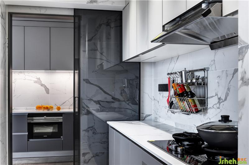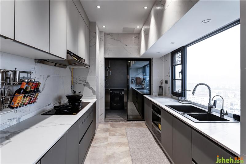 廚房的設計大膽的采用了玻璃窗面,讓視野更具開闊性,而選色與材質,都秉持簡單純粹的原則,讓室內與室外形成反差,雖然放眼望去是高樓林立,但還是讓人仿佛置身于自然浪漫的別樣空間。