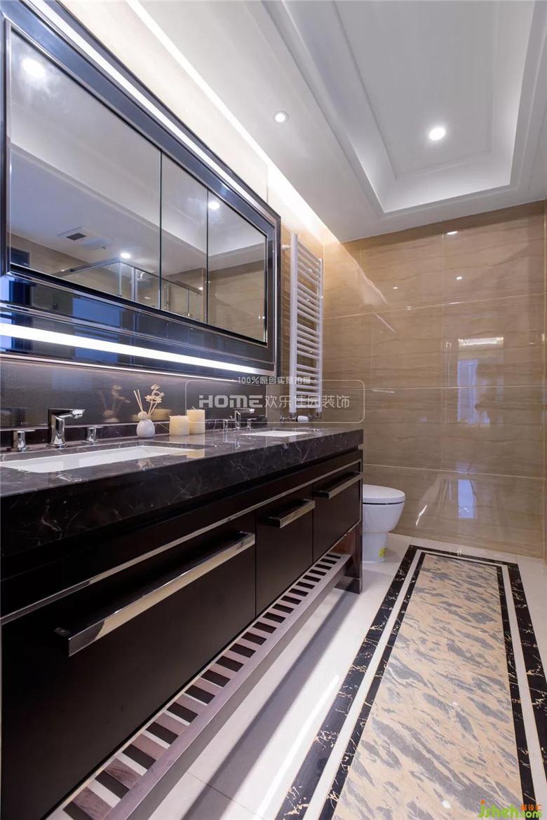 根據(jù)家人的生活習(xí)慣考量,主衛(wèi)的色彩搭配和材料的使用風(fēng)格都與整體相符,洗漱臺(tái)的深色雅致玉石與淺色墻面碰撞出強(qiáng)烈的現(xiàn)代感,空間的功能安排,動(dòng)線合理,梳理有度。