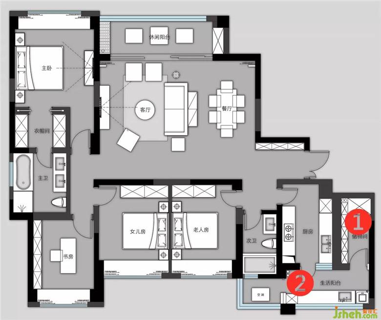 原房廚房操作空間相對(duì)其他區(qū)域小,即便大面積采光,室內(nèi)光線還是暗淡,聽取了設(shè)計(jì)師的建議將生活陽臺(tái)封閉,增加一排櫥柜;在各處小細(xì)節(jié)上也是花了一番心思,從操作臺(tái)面到燈光位置分布的改善,不僅提升了空間亮度還延展了活動(dòng)區(qū)域。