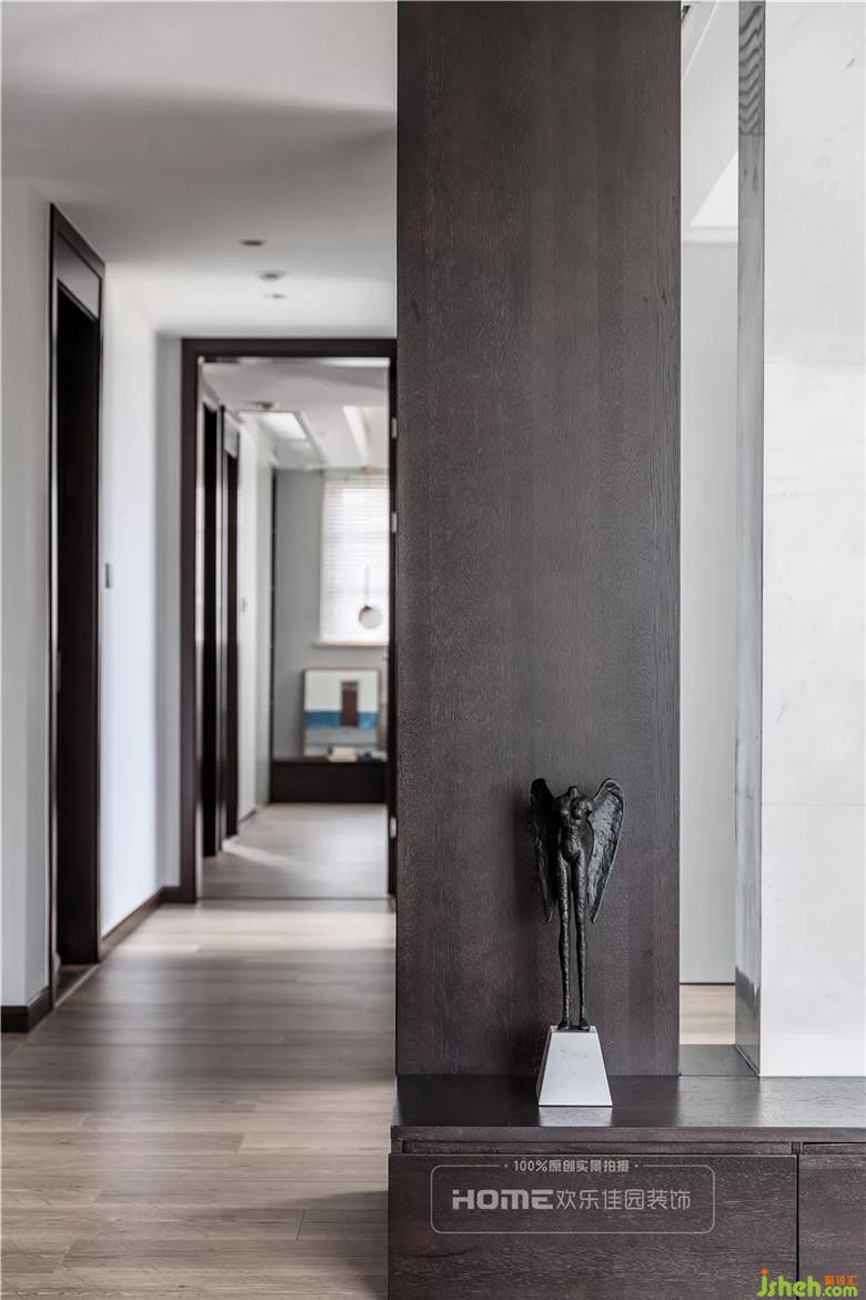 設(shè)計師將尖銳的墻角去掉,化整為零,循序漸進,將冰冷的墻磚轉(zhuǎn)變成溫度、質(zhì)感的鏤空木飾面板,這也是整套案例的亮點之一。