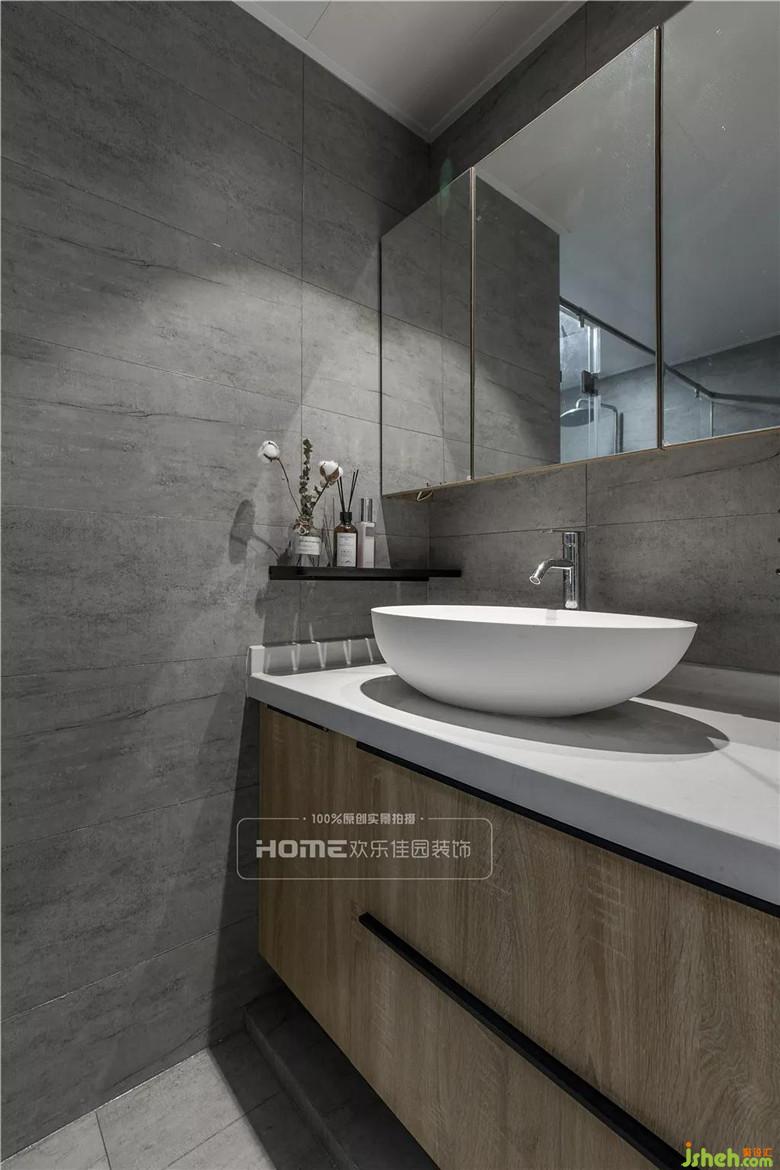 洗手臺上的大鏡子增加空間感,使衛(wèi)生間看起來不那么局促,灰色系墻磚看起來充滿時尚與創(chuàng)意,洗手臺下的大吊柜可以收納洗漱用品,收納功能強大又節(jié)省空間。