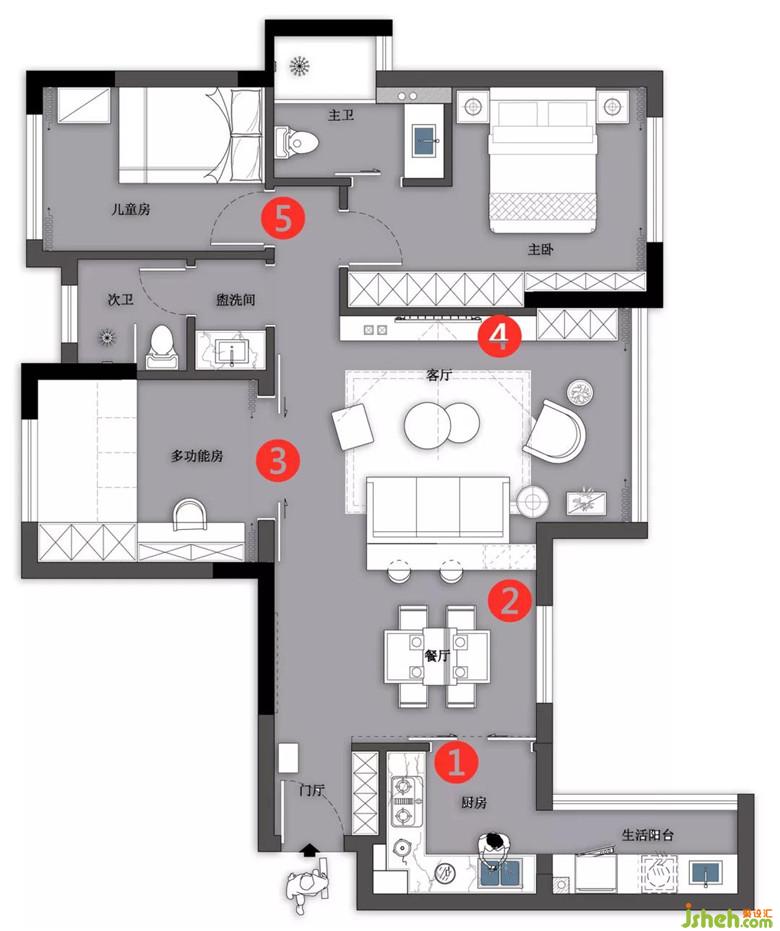 加寬廚房門洞,設計成外掛于頂的雙推玻璃門,并以此定義空間功能,門內吳先生柴米油鹽,門外吳太太琴棋書畫。