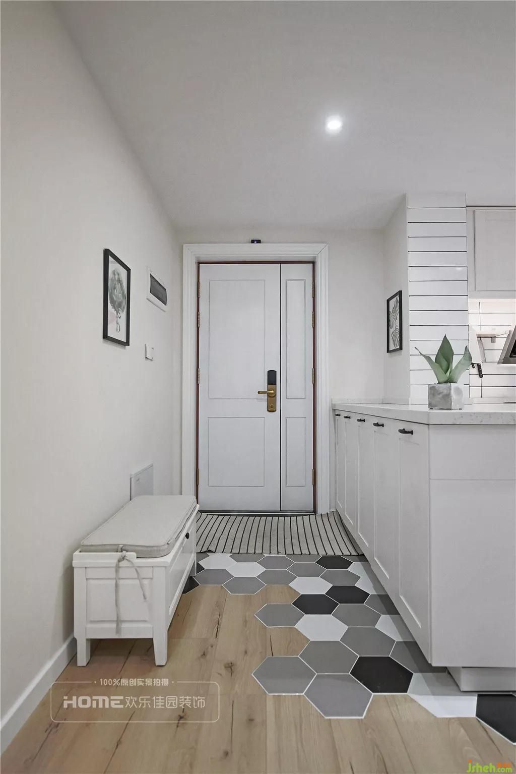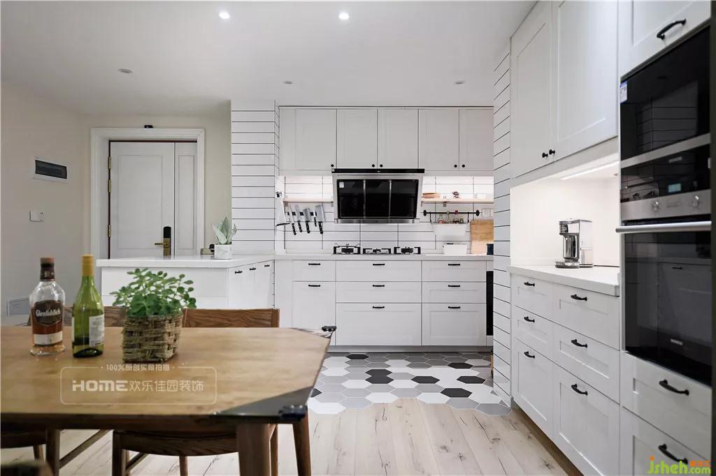 設(shè)計(jì)師征求濮先生意見后,考慮將生活陽臺封閉以及拆除廚房和入戶的墻體。設(shè)計(jì)成現(xiàn)在的廚房和入戶柜體背靠背的雙面柜,一面是“u”型櫥柜,一面是鞋柜,擴(kuò)大了進(jìn)門的視覺空間,又使得廚房的操作和儲物成倍的提升。