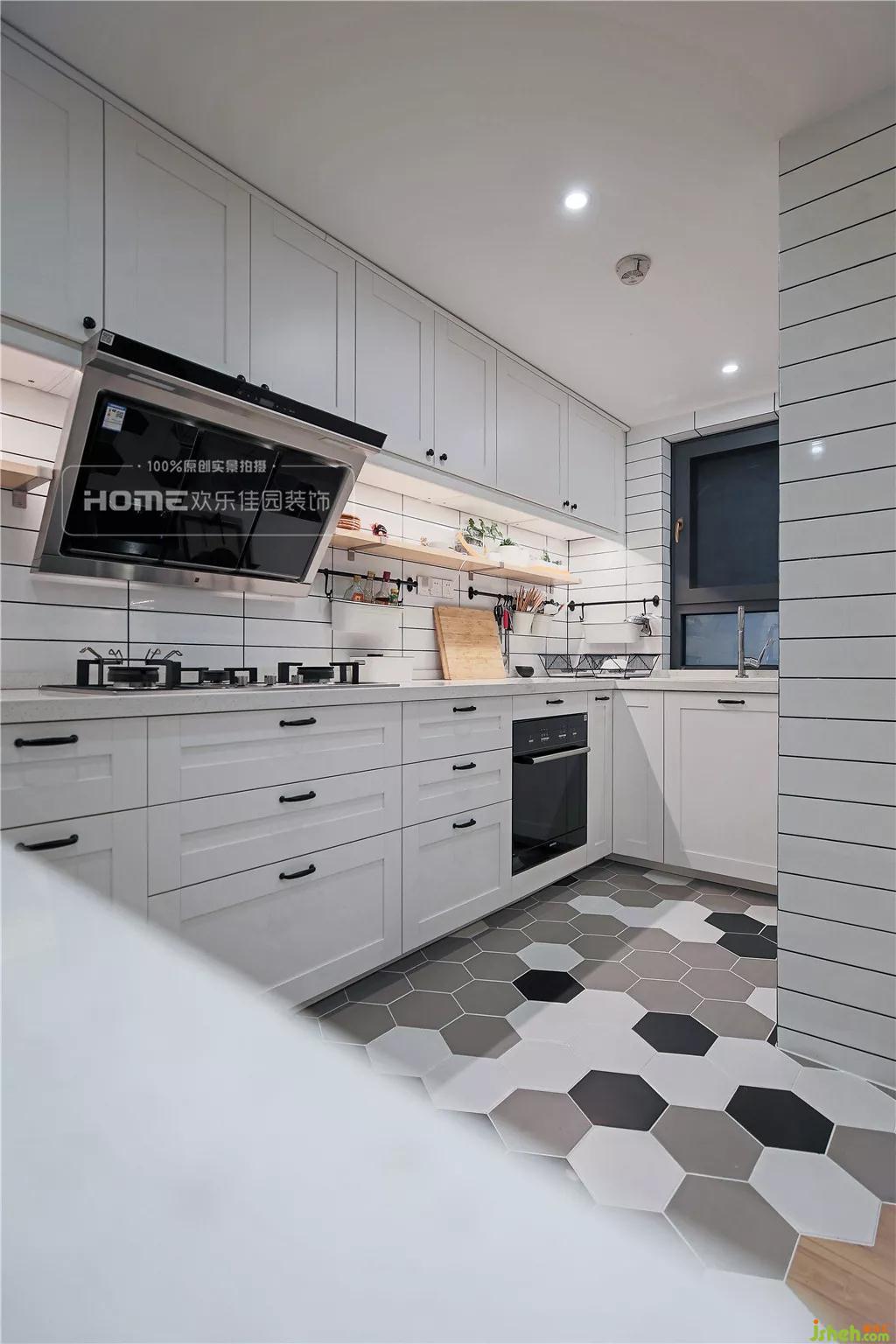 黑白灰的六角磚從入戶一直延續(xù)到廚房,空間的連接性和延伸性得以最佳的展露。色彩單一的臺面和櫥柜,可以置放濮先生的茶愛好,也不至于搶了客餐廳的風(fēng)頭,反而增加了融入感。
